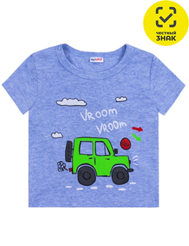 Футболка ясельная из гладкокрашеного полотна, короткие втачные рукава, округлый вырез горловины, окантованный бейкой из основного полотна, застежка по плечу на кнопки, на полочке печать.