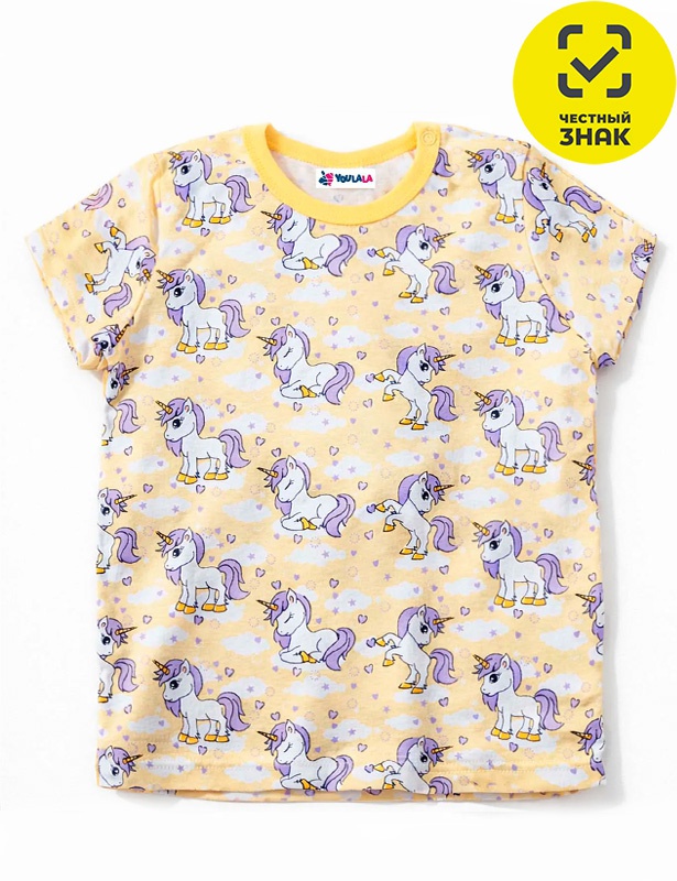 Футболка ясельная из гладкокрашеного полотна, короткие втачные рукава, округлый вырез горловины, окантованный бейкой из основного полотна, застежка по плечу на кнопки, на полочке печать.