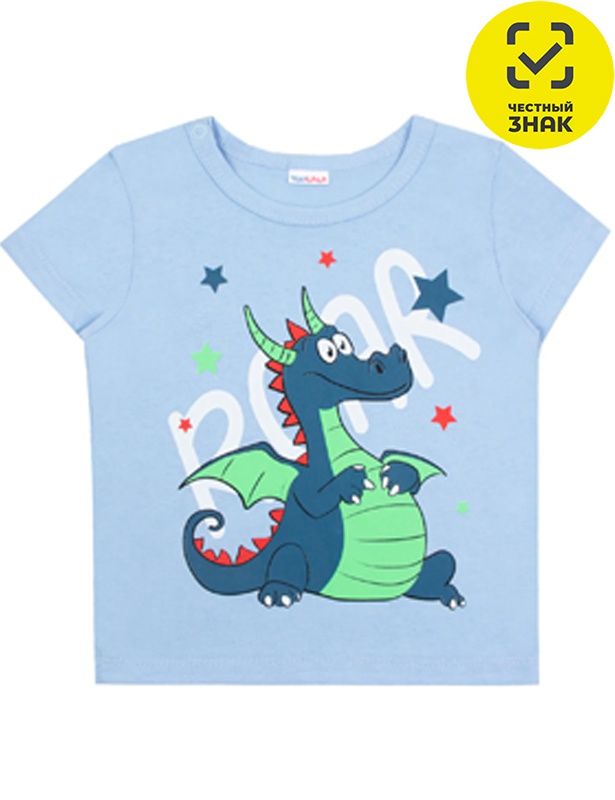Футболка ясельная из гладкокрашеного полотна, короткие втачные рукава, округлый вырез горловины, окантованный бейкой из основного полотна, застежка по плечу на кнопки, на полочке печать.