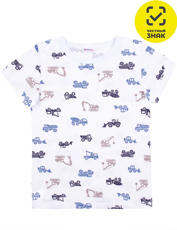 Футболка ясельная из набивного полотна, короткие втачные рукава, округлый вырез горловины, окантованный бейкой из основного полотна, застежка по плечу на кнопки.