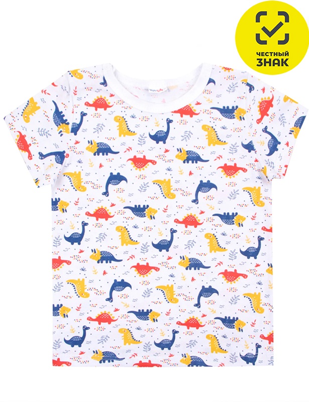 Футболка ясельная из набивного полотна, короткие втачные рукава, округлый вырез горловины, окантованный бейкой из основного полотна, застежка по плечу на кнопки.