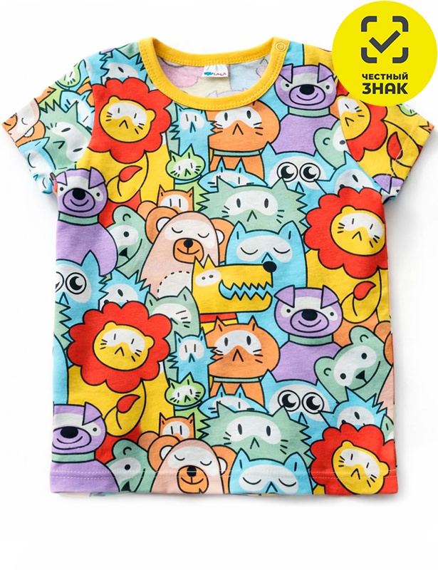 Футболка ясельная из набивного полотна, короткие втачные рукава, округлый вырез горловины, окантованный бейкой из основного полотна, застежка по плечу на кнопки.