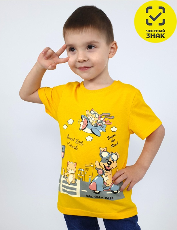 Футболка для мальчика - прямой силуэт, короткий втачной рукав. Горловина обработана ластиком. Печать на переде и спинке.