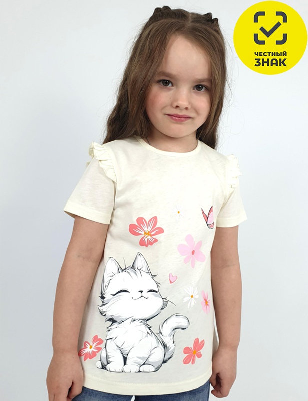 Футболка для девочки - силуэт трапеция, короткий втачной рукав, в пройме рюша. Горловина окантована, застежка на пуговицу по спинке. Печать на переде.