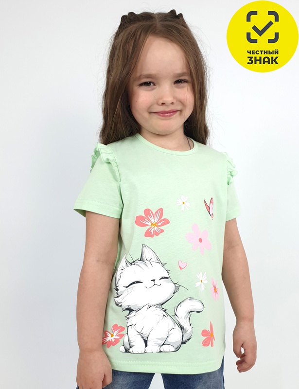 Футболка для девочки - силуэт трапеция, короткий втачной рукав, в пройме рюша. Горловина окантована, застежка на пуговицу по спинке. Печать на переде.
