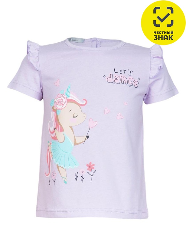 Футболка для девочки - силуэт трапеция, короткий рукав, в пройме рюша. Горловина окантована, застежка на пуговицу по спинке. Печать на переде.