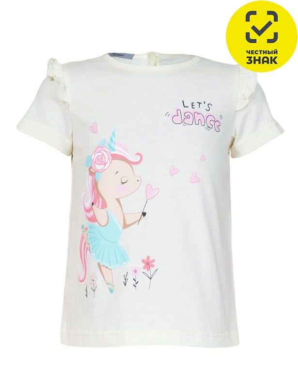 Футболка для девочки - силуэт трапеция, короткий рукав, в пройме рюша. Горловина окантована, застежка на пуговицу по спинке. Печать на переде.
