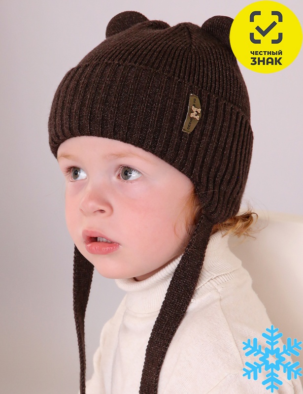 Шапка для мальчика, выполнена из пряжи с добавлением шерсти, на подкладе из флиса. Шапка с широким отворотом, на завязках, декорирована нашивкой