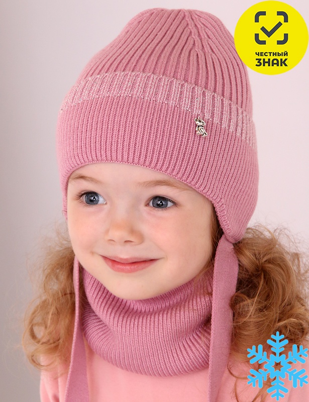 Набор для девочки шапка+снуд, выполнен из пряжи с добавлением вискозы, на подкладе из флиса. Шапка с широким отворотом, на завязках, декорирована брошью.