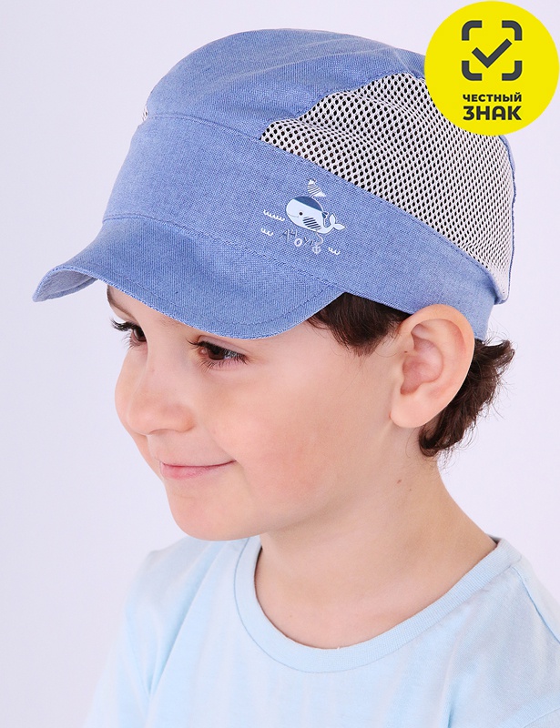 Бейсболка для мальчика из хлопкового полотна со вставкой из сетки, спереди бейсболка декорирована рисунком, сзади фиксируется по обхвату головы при помощи застежки.