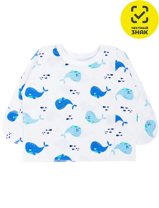 Распашонка из набивного полотна, с застежкой на плече, швы наружу. Горловина обработана рибаной хб. Закрытый рукав. Срезы окантованы.