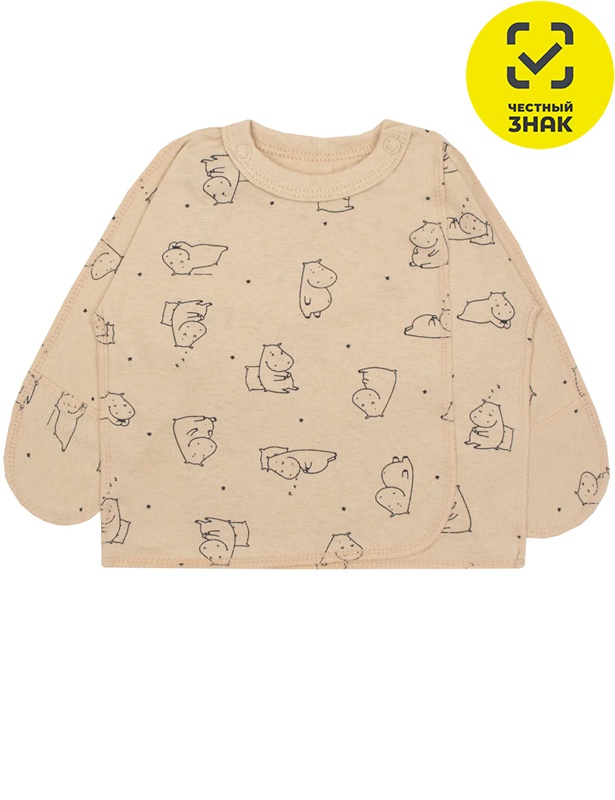 Распашонка из набивного полотна, с застежкой на плече, швы наружу. Горловина обработана рибаной хб. Закрытый рукав. Срезы окантованы.