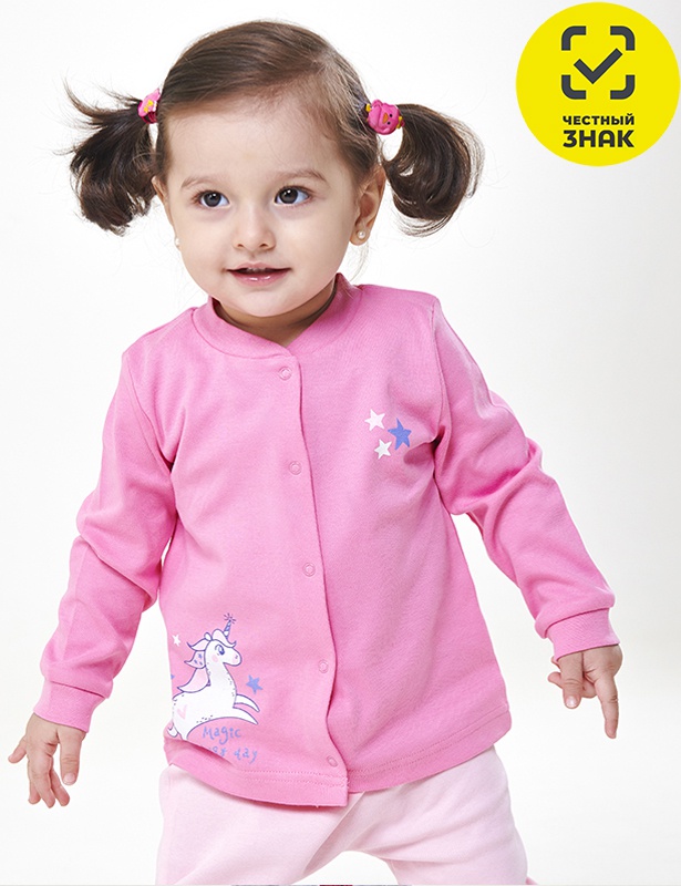 Кофточка с длинным рукавом и центральной застежкой по переду на кнопки из мягкого интерлока. Воротник-стойка и манжеты рукавов выполнены из рибаны с эластаном. Перед декорирован милым принтом.