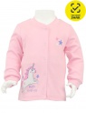 Кофточка с длинным рукавом и центральной застежкой по переду на кнопки из мягкого интерлока. Воротник-стойка и манжеты рукавов выполнены из рибаны с эластаном. Перед декорирован милым принтом.