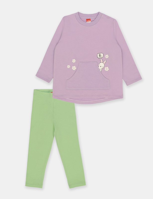 Комплект для девочки: удлиненный джемпер из мягкого футера с начесом и лосины из трикотажа в рубчик. Джемпер с длинным рукавом. Горловина круглая, оформлена кашкорсе. На плече застежка на кнопки. На полочке расположен карман и выполнена шелкография в виде кролика, который выглядывает из кармана.