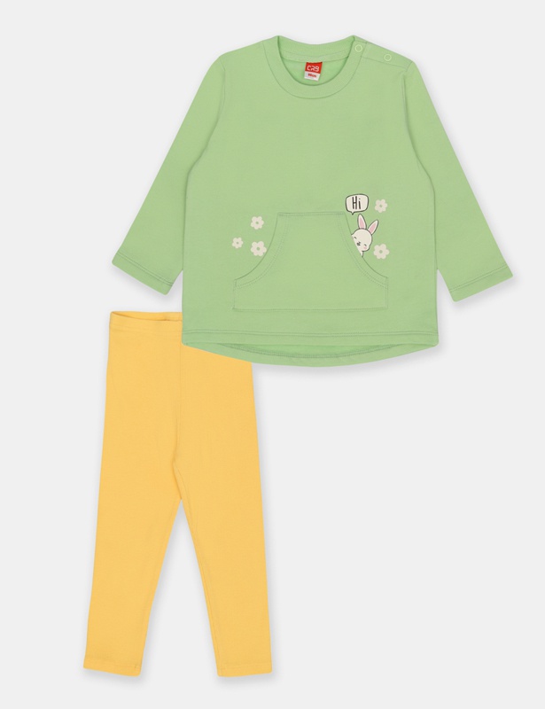 Комплект для девочки: удлиненный джемпер из мягкого футера с начесом и лосины из трикотажа в рубчик. Джемпер с длинным рукавом. Горловина круглая, оформлена кашкорсе. На плече застежка на кнопки. На полочке расположен карман и выполнена шелкография в виде кролика, который выглядывает из кармана.