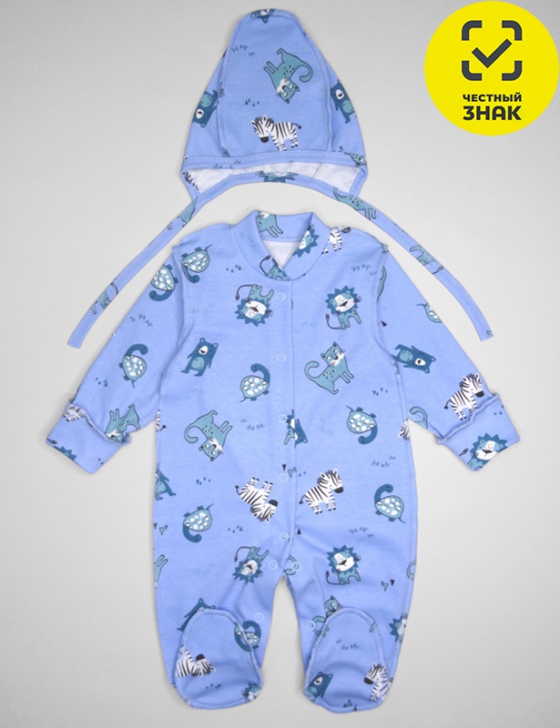 Комплект из трикотажного полотна интерлок. Комбинезон манжета с отворотом, с застежкой на кнопке по центру и по шаговому шву и чепчик. Комбинезон и чепчик в размере 16 и 18 сшиты швами наружу. Комплекты упакованы по 1 штуке.