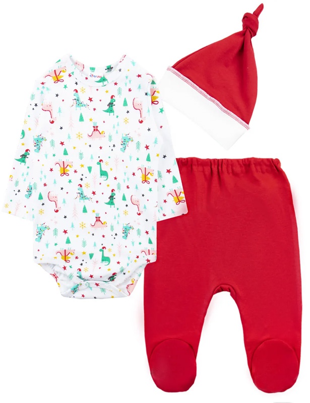 Комплект детский состоит из 3-х предметов. Боди из набивного полотна, с длинным втачным рукавом с манжетом, округлый вырез горловины с застежкой на кнопку. Брюки из гладкокрашеного полотна на эластичном поясе, закрытая ножка. Шапочка швами наружу, с узлом на макушки.