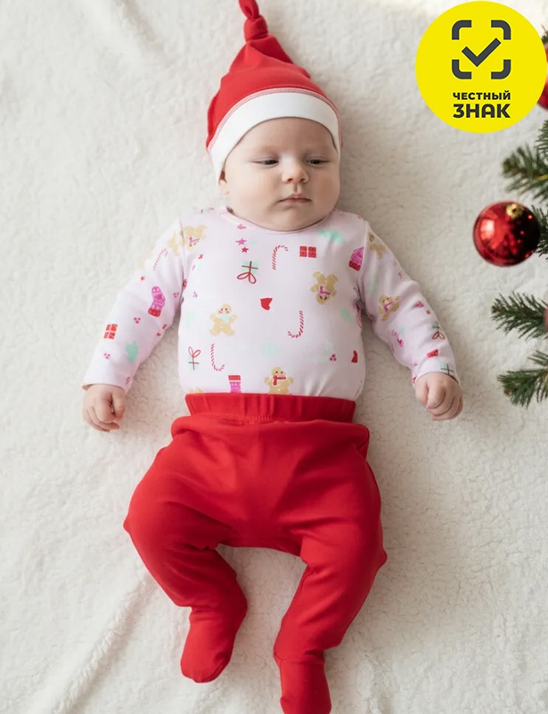 Комплект детский состоит из 3-х предметов. Боди из набивного полотна, с длинным втачным рукавом с манжетом, округлый вырез горловины с застежкой на кнопку. Брюки из гладкокрашеного полотна на эластичном поясе, закрытая ножка. Шапочка швами наружу, с узлом на макушки.