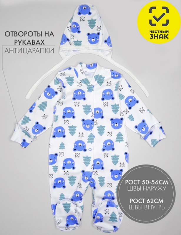 Комплект из трикотажного полотна интерлок. Комбинезон манжета с отворотом, с застежкой на кнопке по центру и по шаговому шву и чепчик. Комбинезон и чепчик в размере 16 и 18 сшиты швами наружу. Комплекты упакованы по 1 штуке.