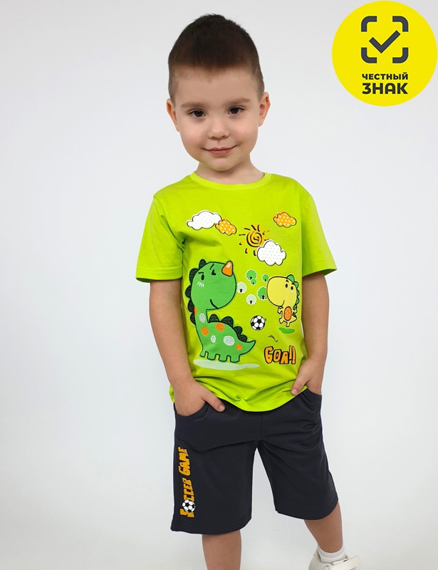 Комплект для мальчика состоит из 2-х предметов. Футболка прямая, перед с печатью и вышивкой. Рукав втачной, короткий. Горловина обработана ластиком. Шорты укороченные с притачным поясом и резинкой. Два боковых кармана. Печать на передней правой половинке.