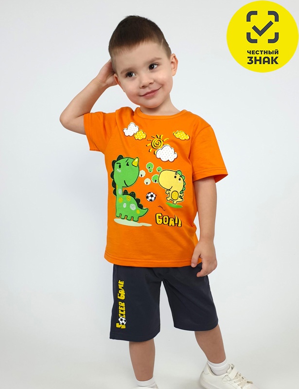 Комплект для мальчика состоит из 2-х предметов. Футболка прямая, перед с печатью и вышивкой. Рукав втачной, короткий. Горловина обработана ластиком. Шорты укороченные с притачным поясом и резинкой. Два боковых кармана. Печать на передней правой половинке.