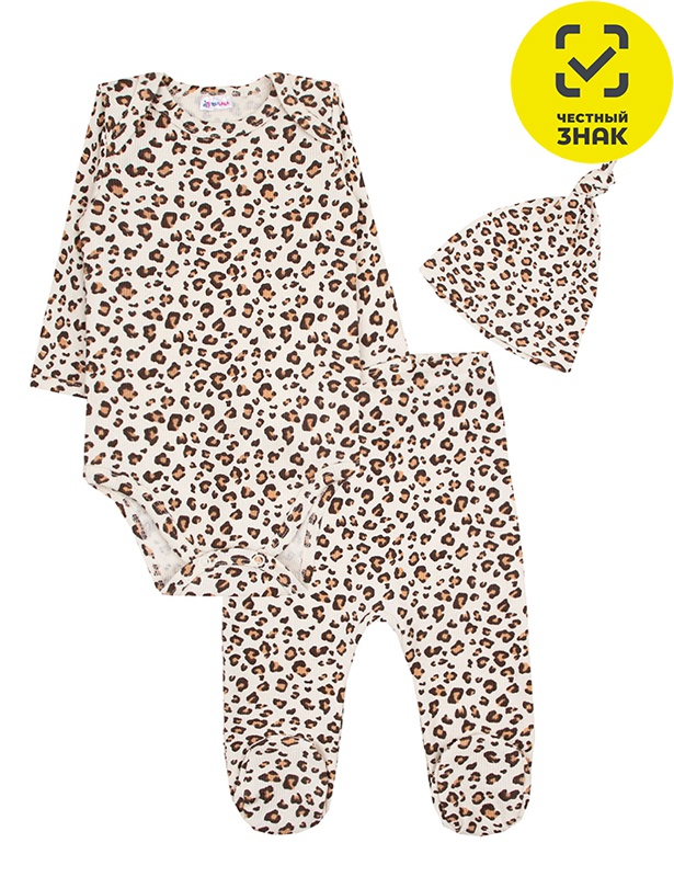 Комплект из рибаны включает три предмета: боди с длинными рукавами, брюки и шапочку. Боди застёгивается по низу на кнопки, а брюки имеют закрытый низ. Шапочка также входит в комплект.