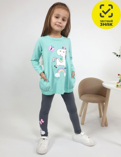 Комплект для девочки. Футболка свободная, с печатью по переду и двумя карманами в боковых швах. Рукав втачной, длинный. Низ изделия подшит с резинкой по боковым швам. Горловина обработана ластиком. Лосины длинные с печатью на правой передней половинке внизу. Вверху на резинке.