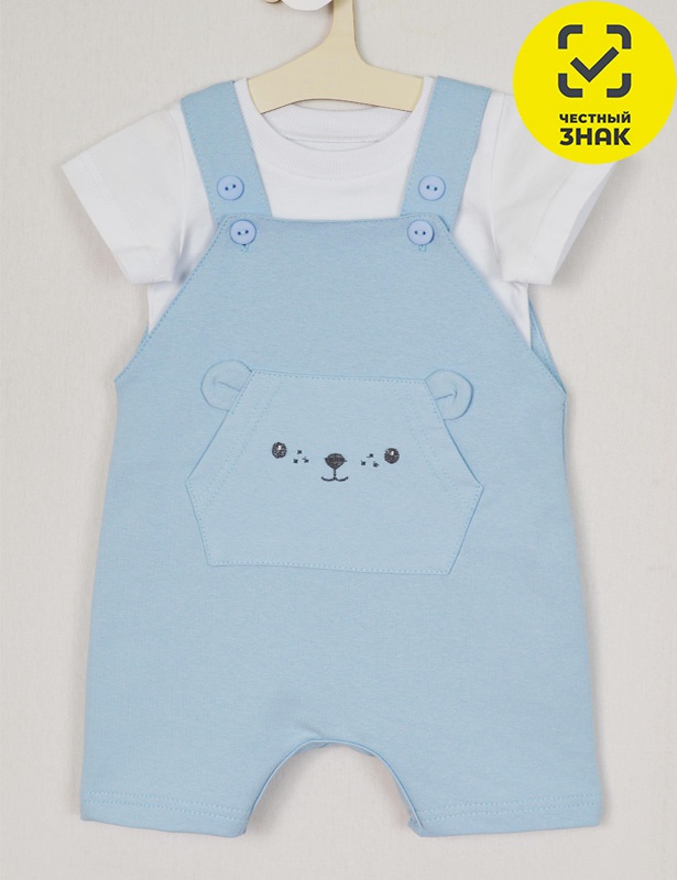 Полукомбинезон свободного кроя на бретелях. Перед с накладным вышитым карманом и отделкой "ушки". Застежка по шаговому шву на кнопках, бретели на пуговицах. Фуфайка прямого силуэта с коротким рукавом, а горловина обработана ластиком.