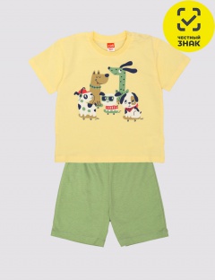 Двухцветный комплект из футболки и шорт. Футболка прямого силуэта с коротким рукавом, круглая горловина, обработанная бейкой из полотна с эластаном. В плечевом шве застёжка на кнопки. Перед футболки украшен ярким принтом. Шорты с цельнокроеным поясом, обработанным плоским швом вподгибку с прокладкой резинки.