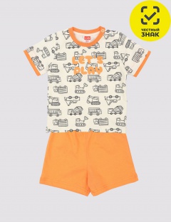 Комплект из набивной футболки и гладких шорт. Футболка прямого силуэта с коротким рукавом, рукава оформлены декоративной бейкой в цвет шорт. Горловина круглая, обработана бейкой из полотна с эластаном в цвет шорт. В плечевом шве застёжка на кнопки. Перед футболки украшен тестовым принтом. Шорты с цельнокроеным поясом с вставленной резинкой.