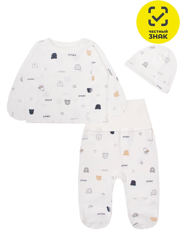 Комплект ясельный из интерлока состоит из 3-х предметов. Распашонка с длинным закрытым рукавом с царапками, ползунки с закрытой ножкой на эластичном поясе, шапочка.