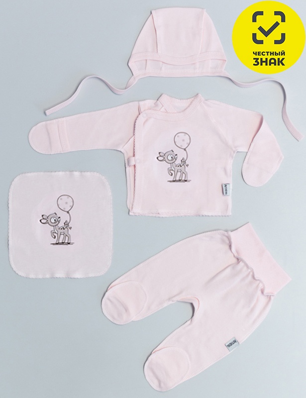 Комплект ясельный, швы наружу, из интерлока, состоит из четырех предметов. Распашонка с полочками «в нахлёст», на кнопках, с царапками и декоративной строчкой «краше» по бейке. Ползунки  ясельные, швы наружу, с закрытой ножкой, с цельнокроенными половинками, с поясом из рибаны-лайкры, на полочке принт. Чепчик на завязках, с мысиком. Платочек с принтом и декоративной строчкой «краше» по бейке.