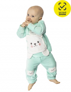 Комплект ясельный (джемпер+брюки). Джемпер прямой на поясе. В горловине воротник-стойка, застежка в плече на кнопки. Перед с вышивкой-аппликацией, накладной карман. Рукав втачной, длинный на манжете. Брюки-длинные на резинке, внизу на манжете. Вышивка на переде в области колен.