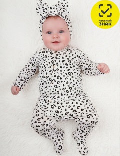 Комплект для девочки состоит из комбинезона и повязки. Комбинезон ясельный из набивного полотна, длинный рукав с манжетом, смещенная застежка на кнопках, воротник-стойка, закрытая ножка. Повязка с бантом.