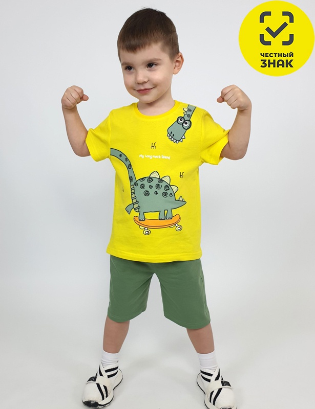 Комплект для мальчика (футболка+шорты). Футболка-прямая, перед с печатью и вышивкой. Рукав втачной, короткий. Горловина обработана ластиком. Шорты-укороченные с притачным поясом и резинкой. Два боковых кармана.