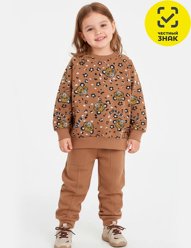 Костюм состоит из 2-х предметов. Джемпер из набивного футера двухнитки с начесом, с длинными рукавами покроя реглан на манжетах, на кнопке по вороту, притачной пояс по низу изделия. Брюки на поясе на резинке, по нижним срезам на манжетах, карманы по бокам, декорированы печатью.