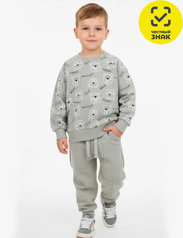 Костюм состоит из 2-х предметов. Джемпер из набивного футера двухнитки с начесом, с длинными рукавами покроя реглан на манжетах, на кнопке по вороту, притачной пояс по низу изделия. Брюки на поясе на резинке, по нижним срезам на манжетах, карманы по бокам, декорированы печатью.