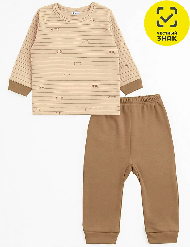 Комплект из интерлока включает два предмета: джемпер и брюки. Джемпер имеет длинные рукава с манжетами и округлую горловину, которая закрывается на кнопки по плечу. Брюки прямого кроя также оснащены манжетами на нижней части и поясом на резинке.