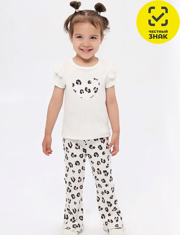 Комплект для девочки состоит из футболки и штанов. Футболка прямого кроя с округлой горловиной и короткими рукавами. На полочке аппликация. В пройме втачная рюша. Брюки длинные, расклешенные. Нижние срезы обработаны декоративным волнообразным швом.
