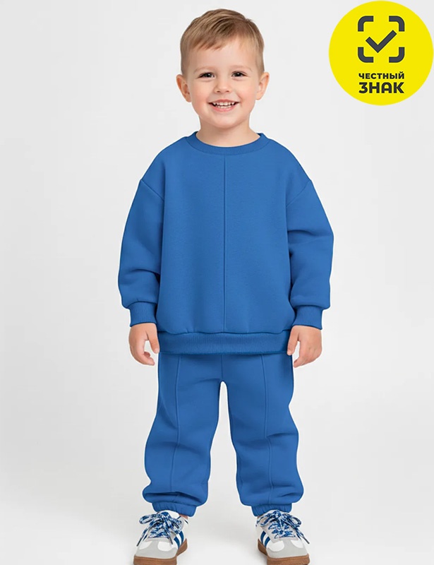 Костюм детский из футера трехнитки с начесом, состоит из 2-х предметов. Толстовка с длинными втачными рукавами на манжетах, со спущенной линией плеча. Брюки на поясе на резинке.