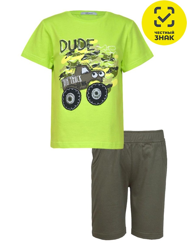 Комплект для мальчика состоит из 2-х предметов. Футболка прямая, перед с печатью и вышивкой. Рукав втачной, короткий. Горловина обработана ластиком. Шорты укороченные с притачным поясом и резинкой. Два боковых кармана.