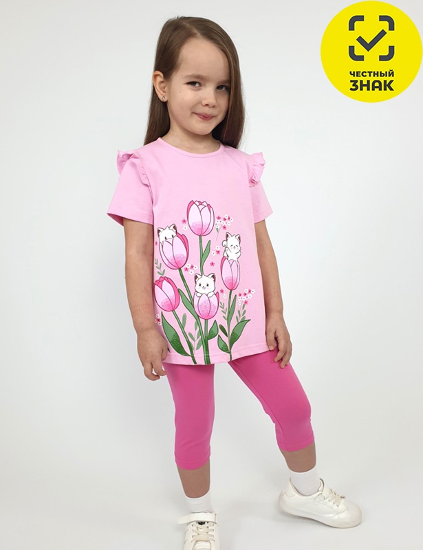 Комплект для девочки (джемпер+ лосины). Джемпер-силуэт трапеция, короткий втачной рукав, в пройме рюша. Горловина окантована, застежка на пуговицу по спинке. Печать на переде. Лосины-укороченные вверху на резинке.