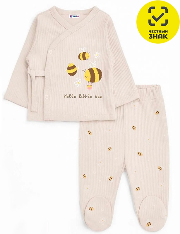 Ясельный комплект из ткани «лапша» состоит из распашонки и ползунков. Распашонка на запах с открытыми рукавами, ползунки закрытые, с резинкой на поясе.