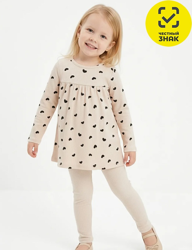 Комплект для девочки состоит из 2-х предметов. Туника из набивного полотна, с длинными втачными рукавами, округлый вырез горловины. Лосины облегающие на поясе на резинке.