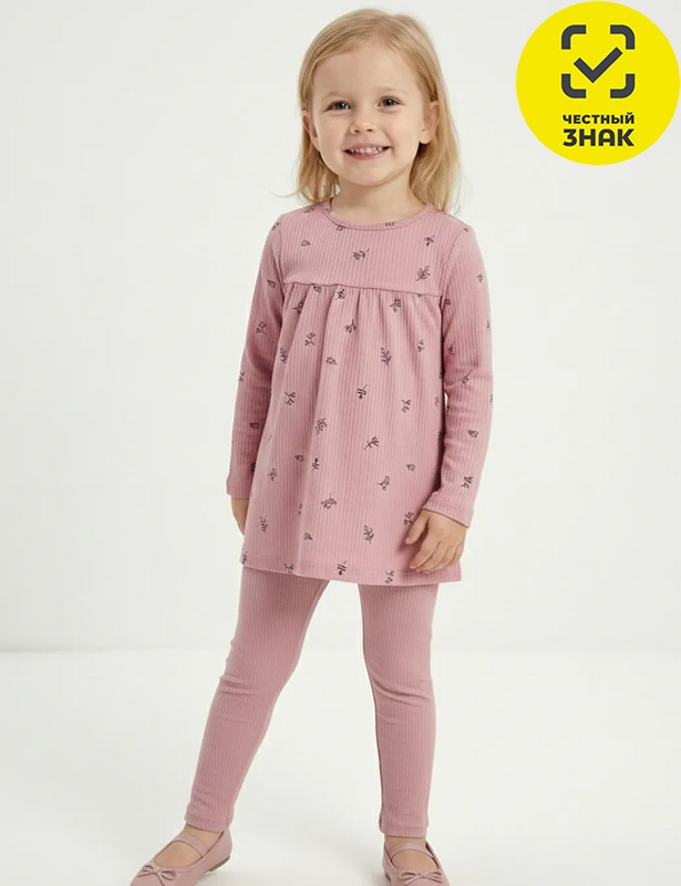Комплект для девочки состоит из 2-х предметов. Туника из набивного полотна, с длинными втачными рукавами, округлый вырез горловины. Лосины облегающие на поясе на резинке.