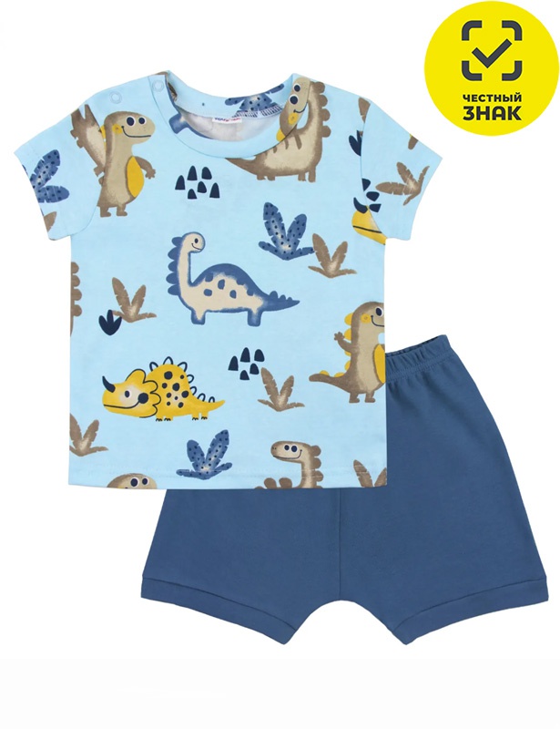 Комплект детский состоит из 2-х предметов. Футболка из набивного полотна, короткие втачные рукава, округлая горловина с застежкой на кнопки. Шорты из гладкокрашеного полотна, на поясе на резинке.