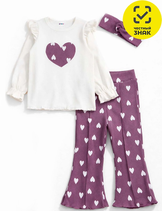 Комплект для девочки состоит из джемпера, брюк и повязки на голову. Джемпкер прямого кроя с округлой горловиной и длинными рукавами с рюшей. На полочке аппликация. В пройме втачная рюша. Брюки длинные, расклешенные. Нижние срезы обработаны декоративным волнообразным швом.