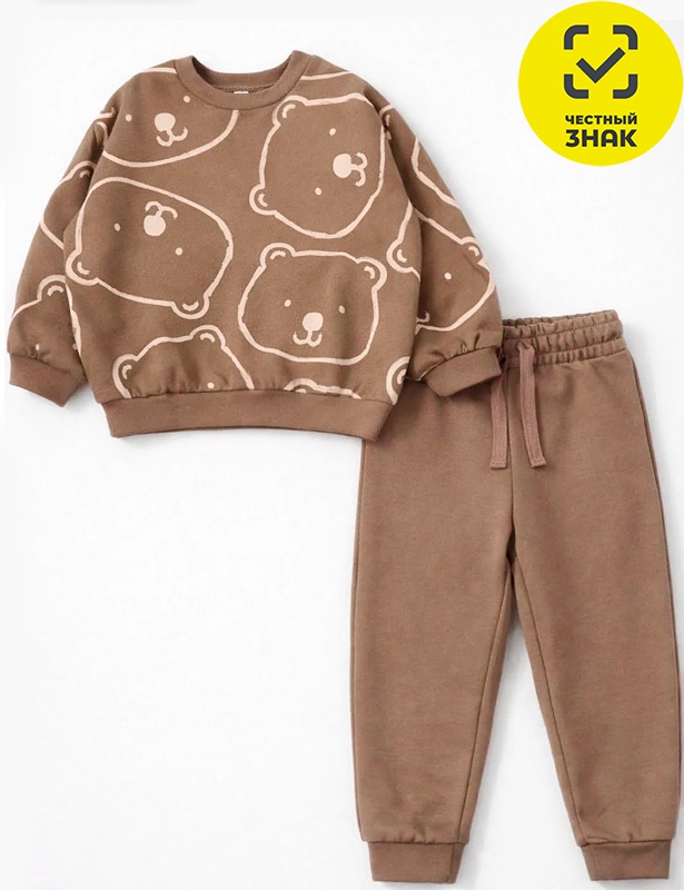 Костюм состоит из 2-х предметов. Джемпер из набивного футера двухнитки с начесом, с длинными рукавами покроя реглан на манжетах, на кнопке по вороту, притачной пояс по низу изделия. Брюки на поясе на резинке, по нижним срезам на манжетах, карманы по бокам.