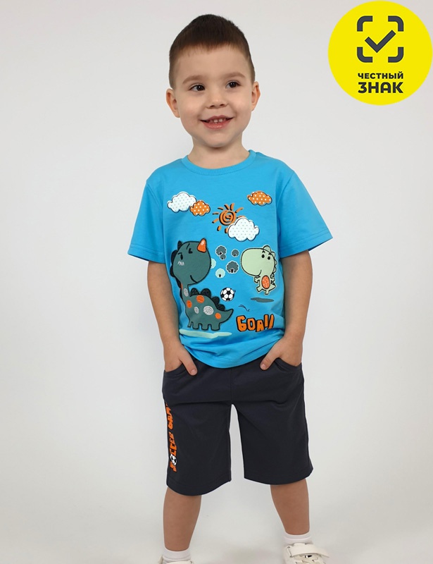 Комплект для мальчика состоит из 2-х предметов. Футболка прямая, перед с печатью и вышивкой. Рукав втачной, короткий. Горловина обработана ластиком. Шорты укороченные с притачным поясом и резинкой. Два боковых кармана. Печать на передней правой половинке.